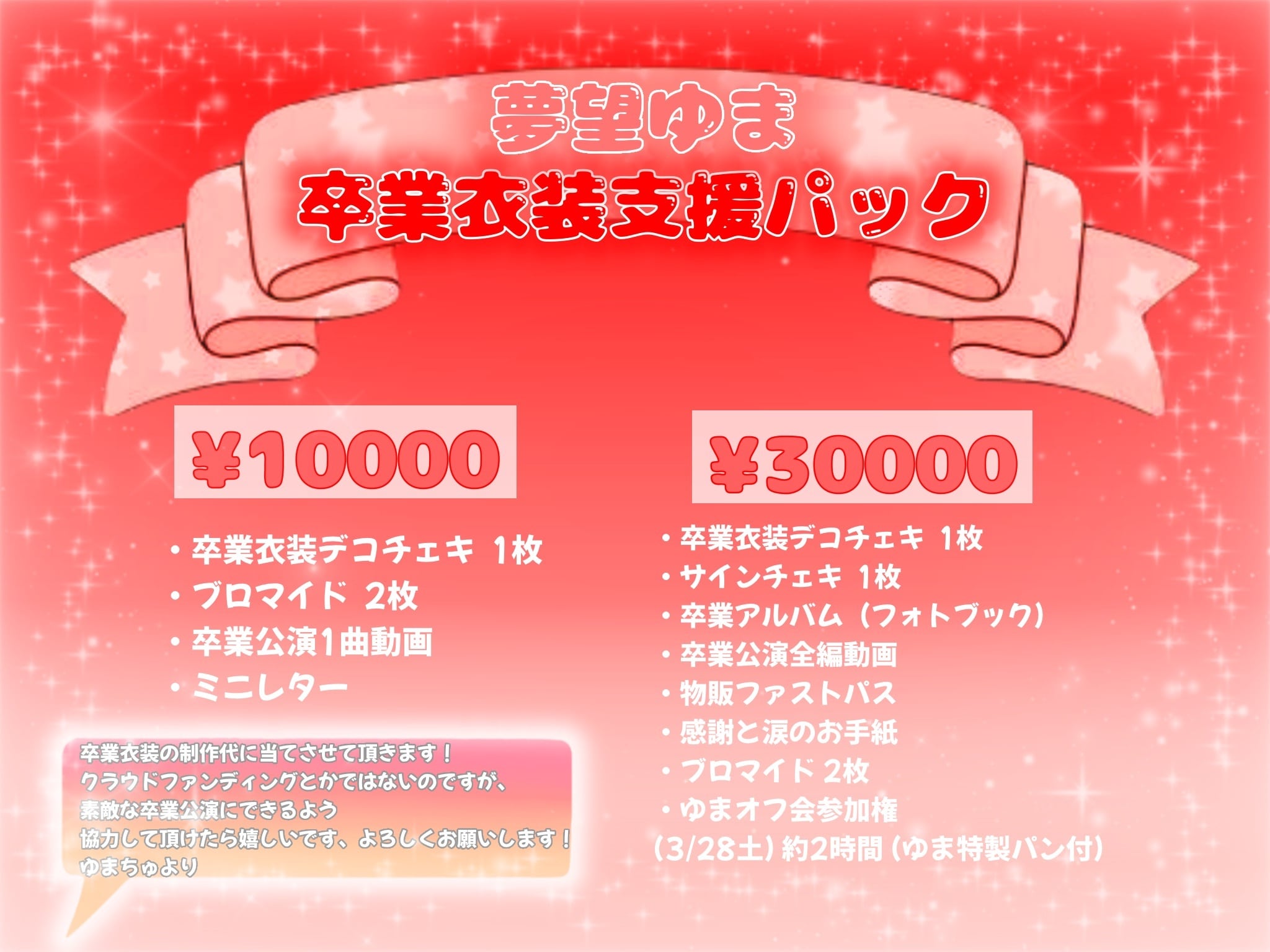 ※30000円パックご購入者の方で特典内容のオフ会に参加できない場合、事前に教えていただければ卒業公演当日、代わりとなるものをお渡しさせていただきます。